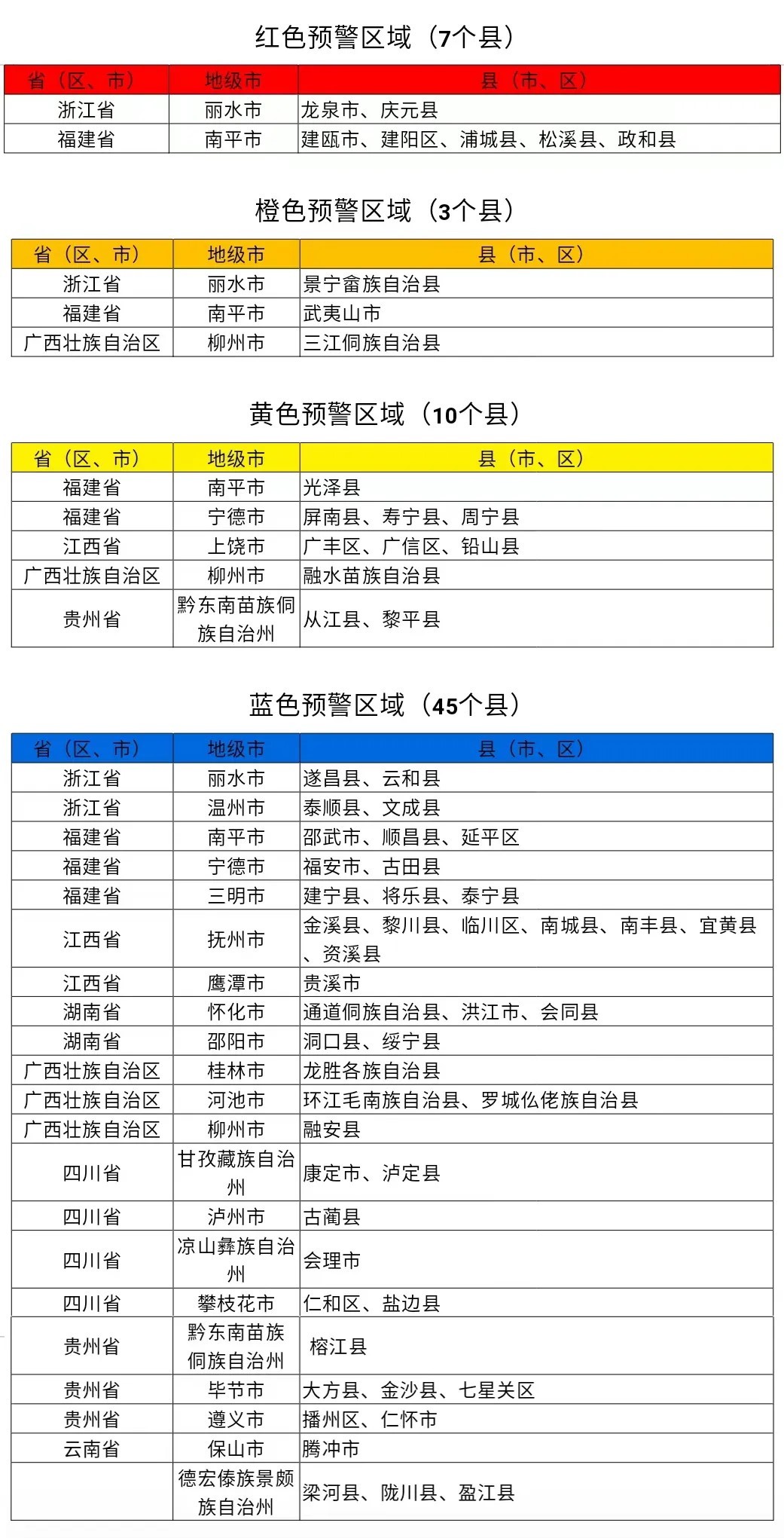 展望,6月16日20时至6月17日20时,浙江西南部、福建北部、广西北部等地部分地区发生山洪灾害可能性大(橙色预警),其中,浙江西南部、福建北部局地发生山洪灾害可能性很大(红色预警),预警区域波及的县(市、区)见下表。其他地区也可能因局地短历时强降水激励山洪灾害,请各地正经作念好及时监测、防汛预警和滚动避险等退缩职责。