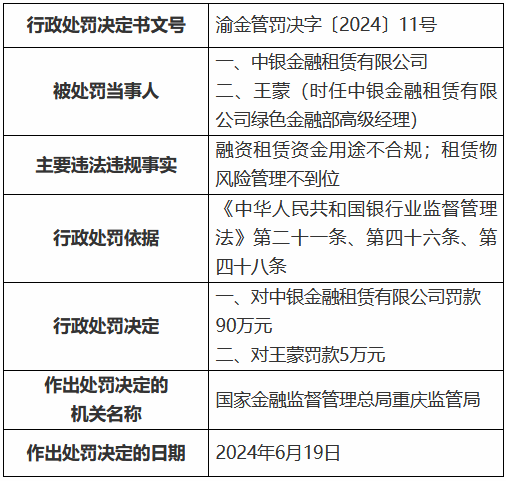 6月21日金融一线音讯,国度金融监督惩办总局重庆监管局行政处罚信息公开表披露,中银金融租出有限公司因融资租出资金用途差异规;租出物风险惩办不到位,被罚金90万元。时任中银金融租出有限公司绿色金融部高等司理王蒙被罚金5万元。