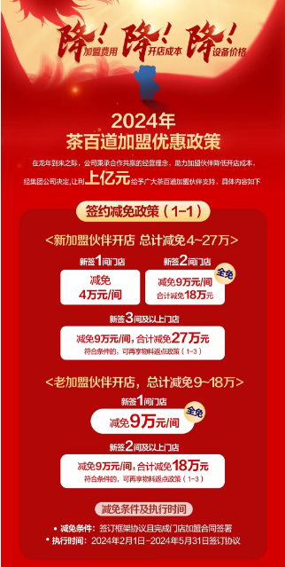 为了争取加盟商和扩大市占率,喜茶、茶百说念、奈雪的茶、书亦烧仙草等多家茶饮品牌在本年上半年接连推出优惠轮番。以茶百说念为例,新加盟商签1家门店,可减免4万元;签2间门店,可累计减免18万元。